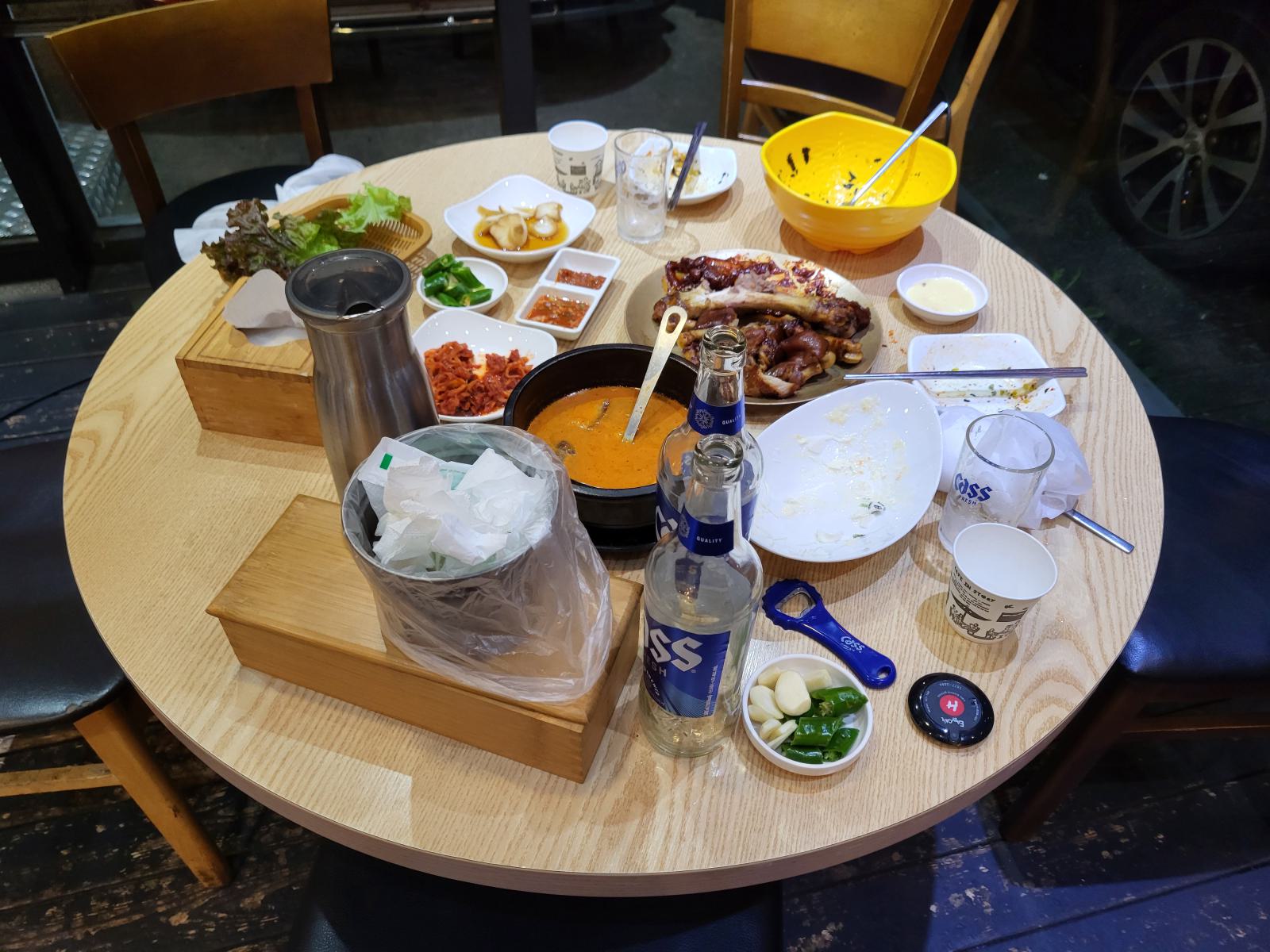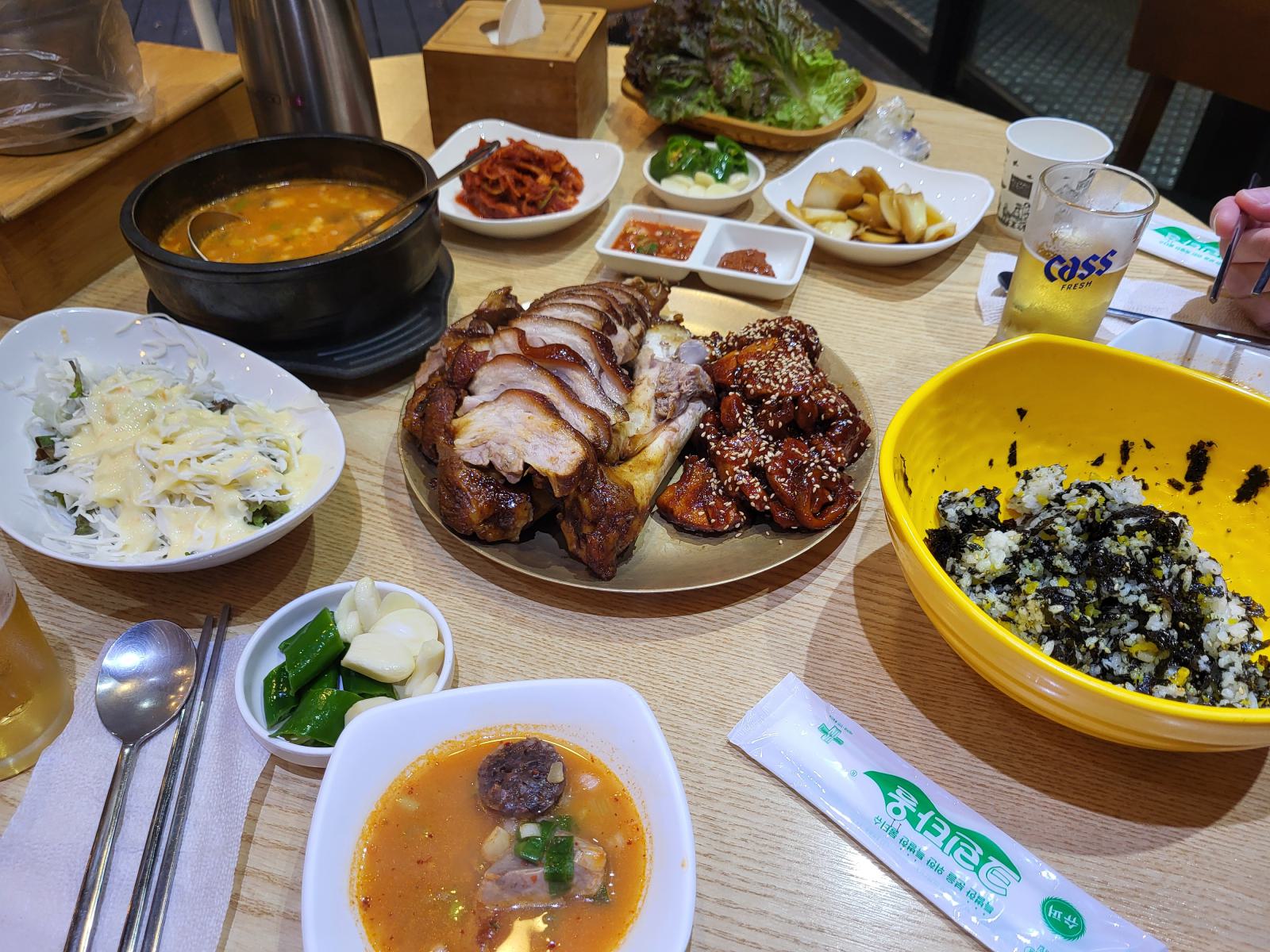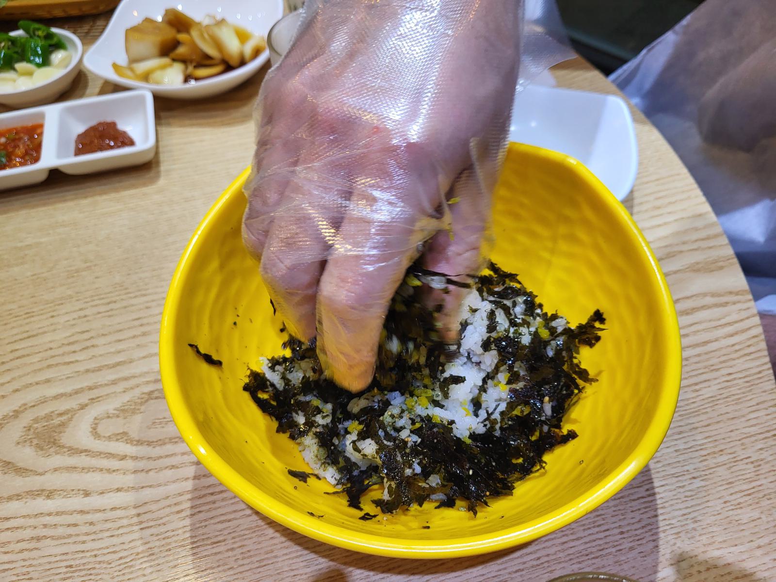 Am Abend kamen wir etwas zu spät los. Hier in der Kleinstadt machen die Restaurants früh zu. Wir schauten uns in den Gassen in Sokcho Beach um, der einzige Laden, in dem die Küche noch nach 19 Uhr geöffnet hatte, war ein Eisbein-Restaurant, eine lokale Spezialität. Eine kleine Portion sollte für uns beide reichen, meinte die Bedienung. Sie muss es wissen. Außerdem meinte sie, dass man das Zeug scharf essen muss. Aber scharf sei wirklich sehr scharf, also für uns wahrscheinlich zu scharf. Wir entscheiden uns trotzdem für halb scharf, halb ohne und ernteten respektvolle Blicke. Als Beilage wollten wir Reis und was sie uns empfahl, stand auf der Karte als Onigiri. Das geht scheinbar generischer, als ein Dreieck aus Reis: Reis, Nori, irgendwas drin, und irgendwas aus Folie. Wir bekamen also eine Schüssel mit allen Einzelteilen und einen Folienhandschuh.