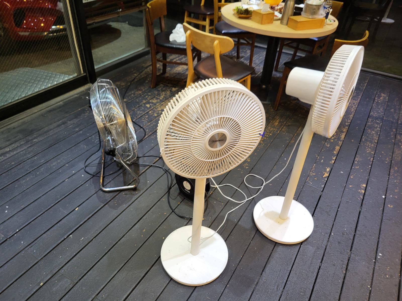 Zu dem “kleinen” Schweineteller gab es wieder mal haufenweise Beilagen, extra Chilis und eine große Suppe mit Blutwurst. Und weil die Leute hier vom vielen Schwein und scharf so viel schwitzen, gab es gleich eine ganze Ventilatoren Armee.