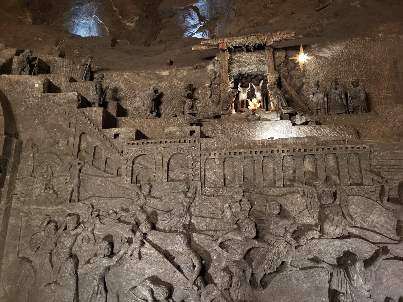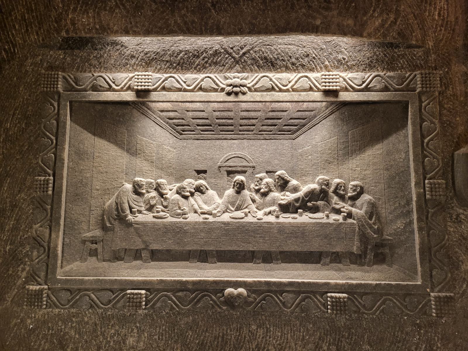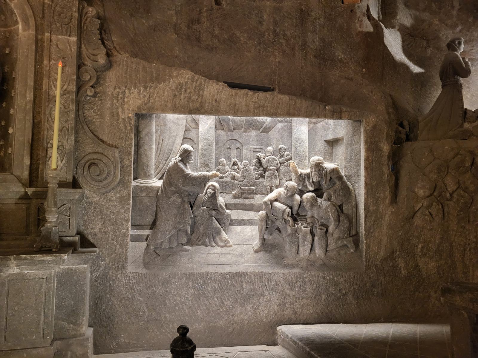 Über zwei breite Treppen geht es hinunter in den riesigen Saal, die Wände sind voll mit Nischen, in denen verschiedene Skulpturen stehen. Große Reliefs zieren die Wände, das letzte Abendmahl aus Salz, Szenen aus dem Minenalltag und Bilder, mit wahnsinng tiefer Perspektive, obwohl sie nur wenige cm tief sind.