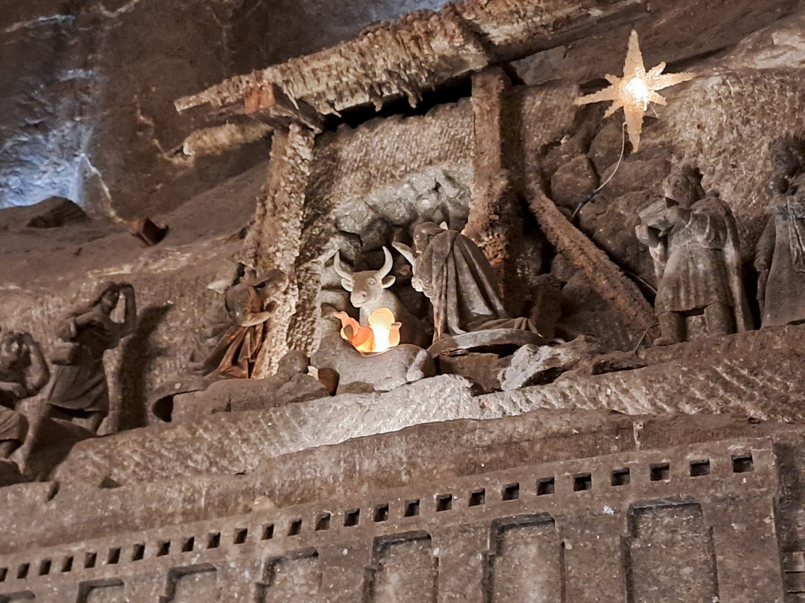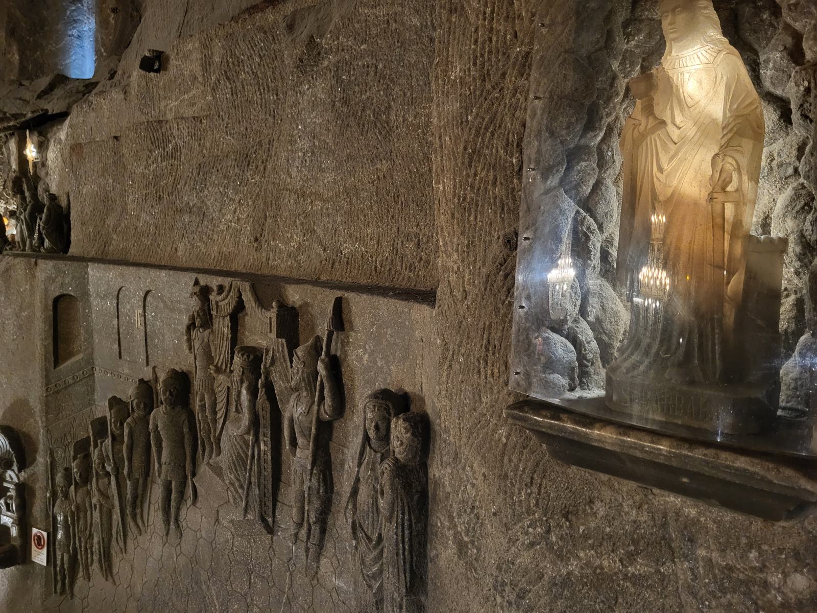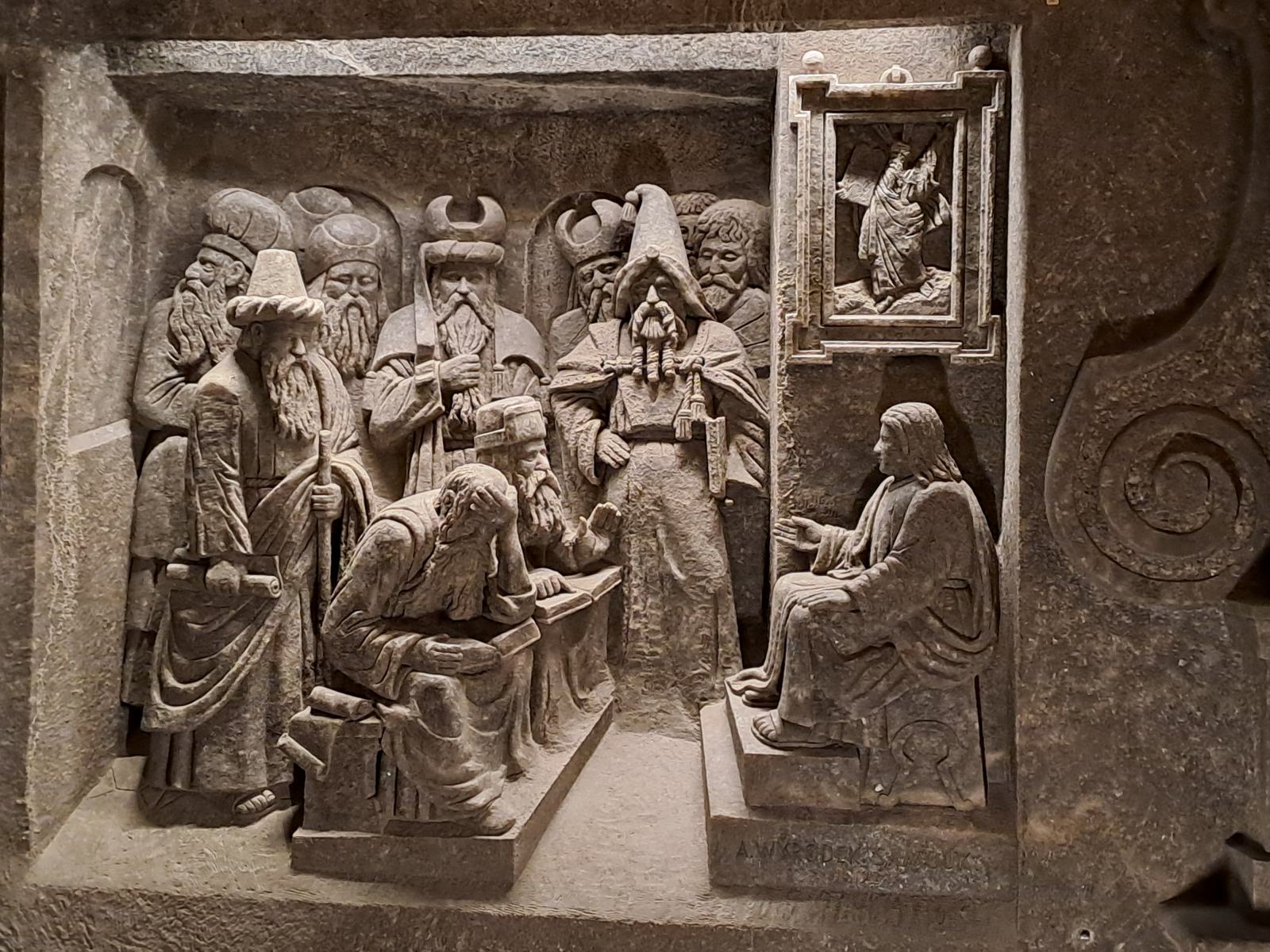 Über zwei breite Treppen geht es hinunter in den riesigen Saal, die Wände sind voll mit Nischen, in denen verschiedene Skulpturen stehen. Große Reliefs zieren die Wände, das letzte Abendmahl aus Salz, Szenen aus dem Minenalltag und Bilder, mit wahnsinng tiefer Perspektive, obwohl sie nur wenige cm tief sind.