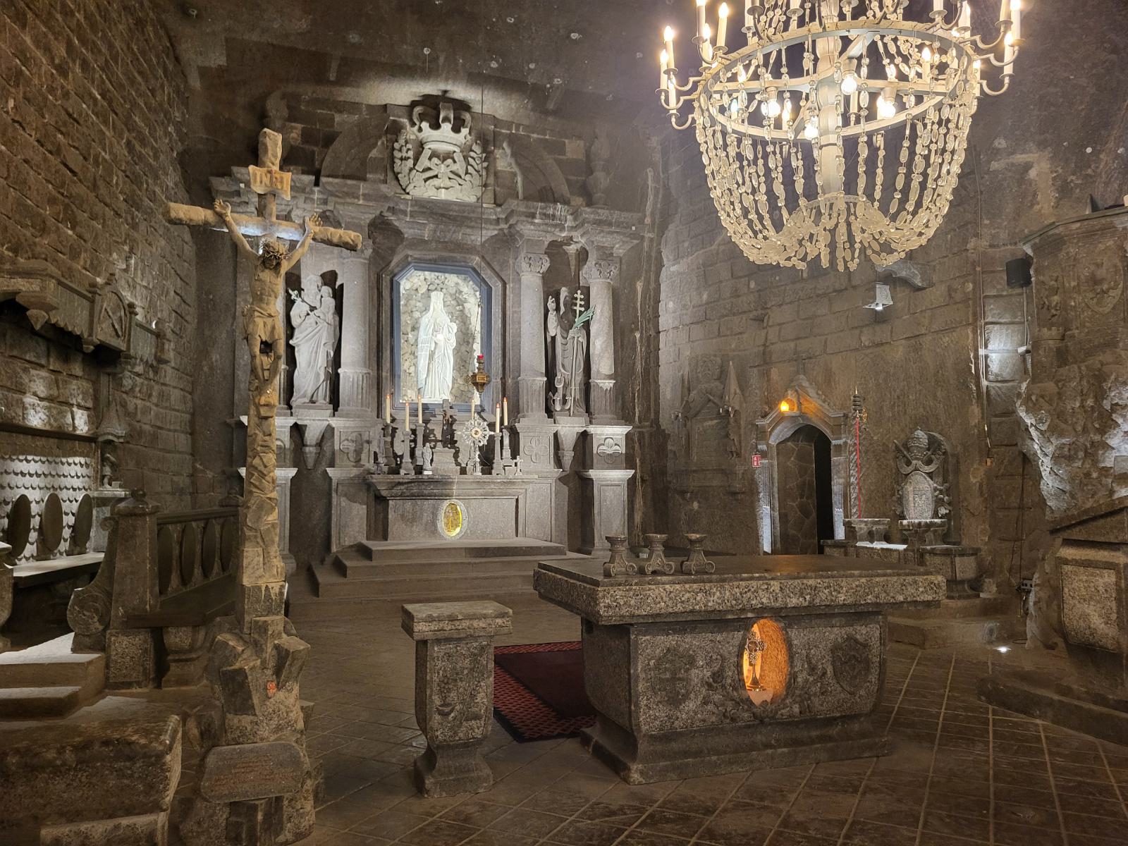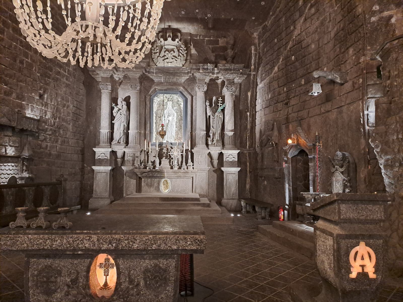 Wir kamen schon längst aus dem Staunen nicht mehr heraus und dachten, wir hätten schon alles gesehen, aber diese Miene hatte immer noch mehr zu bieten. Unvermittelt standen wir auf der Galerie eines atemberaubenden Doms, und blickten auf überdimensionalen, salzige Kronleuchter, die sich in einer Line bis zum weit entfernten Altar ziehen. Das alles haben Bergleute geschaffen. Allein dieser Raum könnte als Hauptsehenswürdigkeit des ganzen Landes durchgehen.