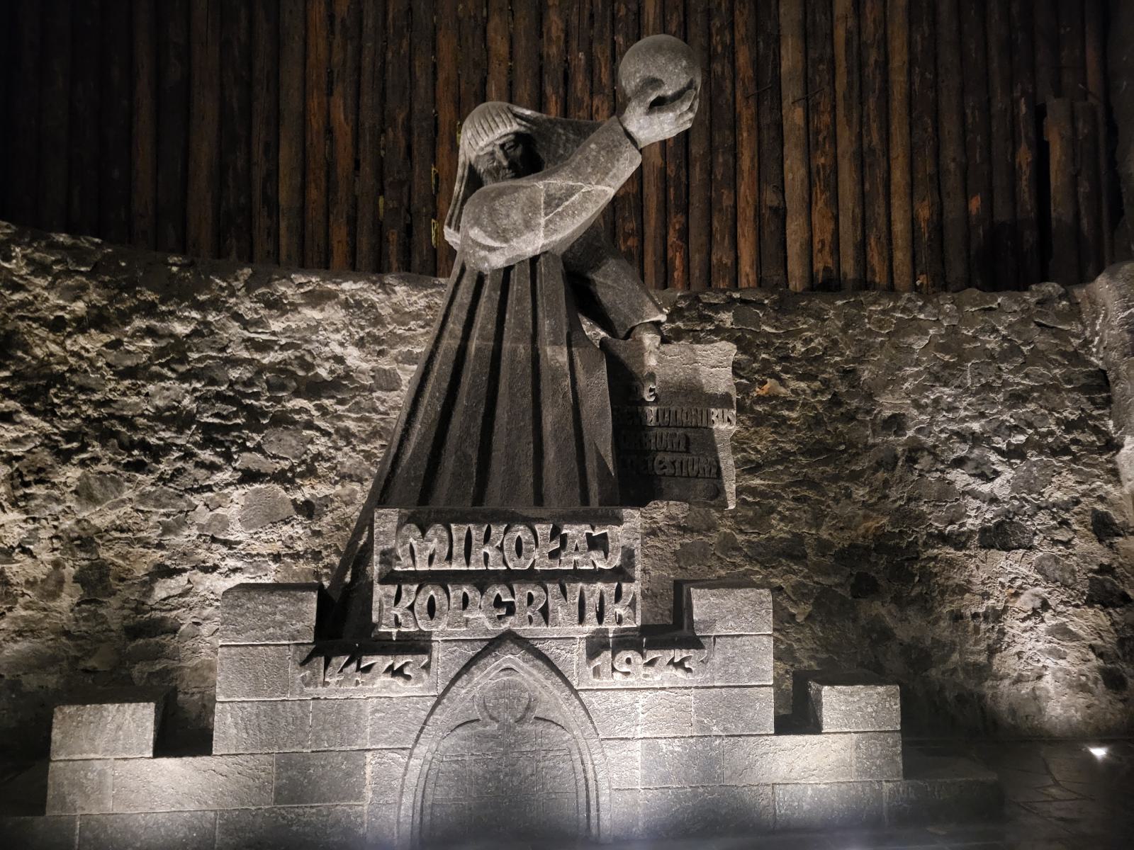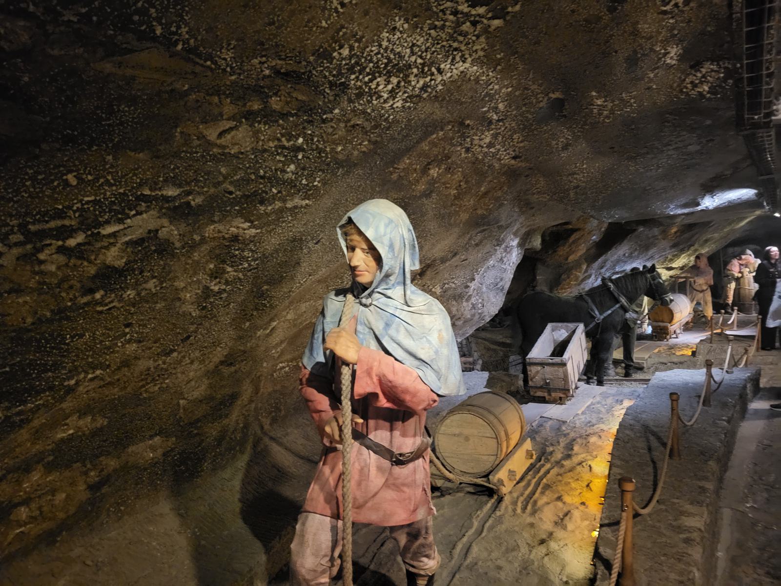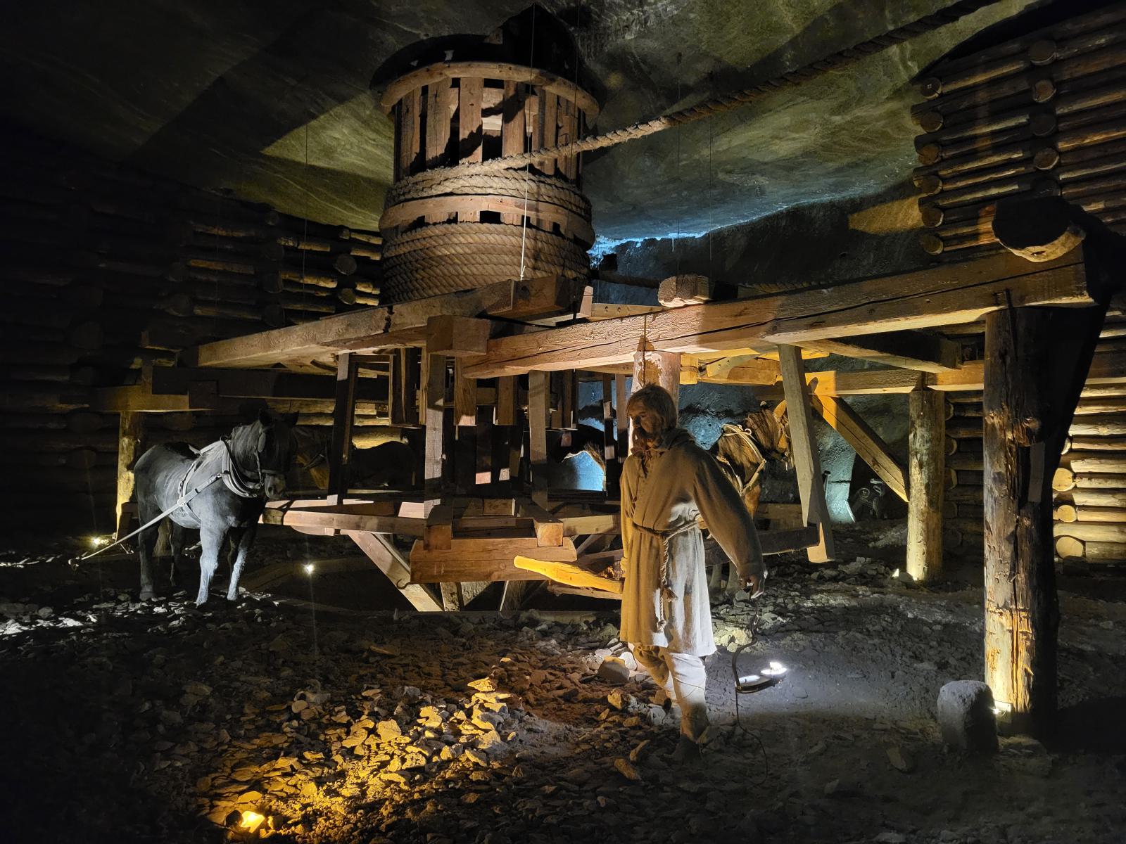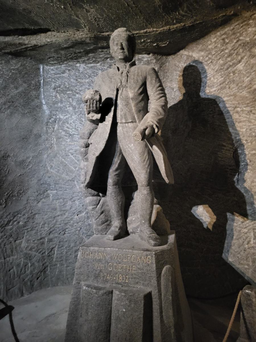 Drei Stunden verbrachten wir in den unterirdischen Räumen und erfuhren dann, dass wir nur etwa ein Prozent der Miene gesehen hatten. Dabei war vieles, was wir hier sahen einfach Wahnsinn, und davon sollte es noch viel mehr geben? Vieles, worüber wir hier staunten, war die Handarbeit von Bergleuten und über die gesamte Anlage verteilt. Es gibt verschiedene Ausstellungen mit lebensgroßen Skulpturen aus Salz. Dort ging es z.B. um die Gründungslegende der Miene. Dabei spielte die untreue ungarische Prinzessin, über die wir schon viel in Krakau erfahren hatten, eine entscheidende Rolle. Ein anderer Raum erzählte von den Minenarbeitern, die mit Fackeln nach Gas suchten um es abzubrennen. Die Szene war aus einer höhlenartigen Wand geschnitzt. Die Animation einer Explosion verdeutlichte, wie gefährlich das war. Auch die an der Arbeit beteiligten Pferde hatten ihren Platz. Neben einer originalen Förderanlage gab es ein kleines bewegtes Modell, mit dem man sich die harte Arbeit gut vorstellen konnte. Es gab Statuen von Kopernikus und von Goethe, Goethe ist scheinbar überall.