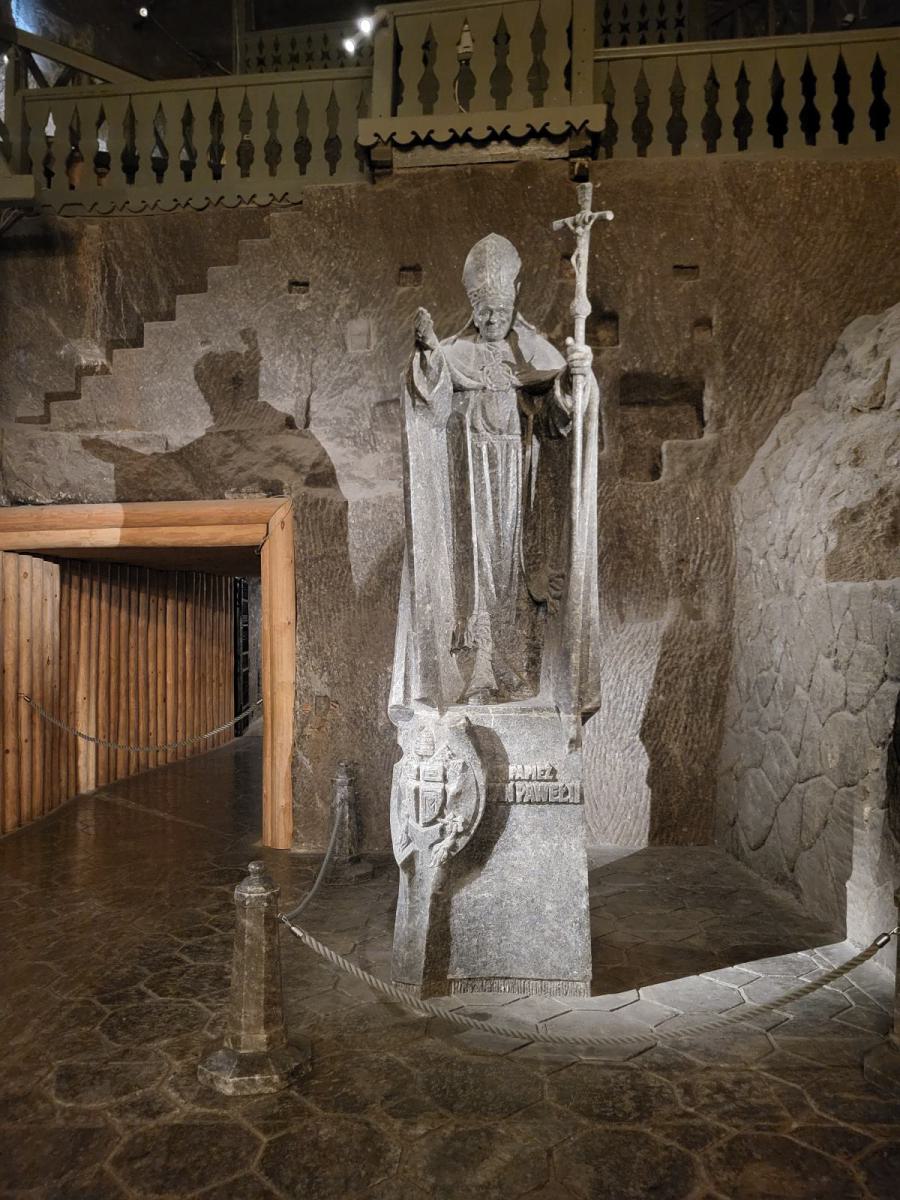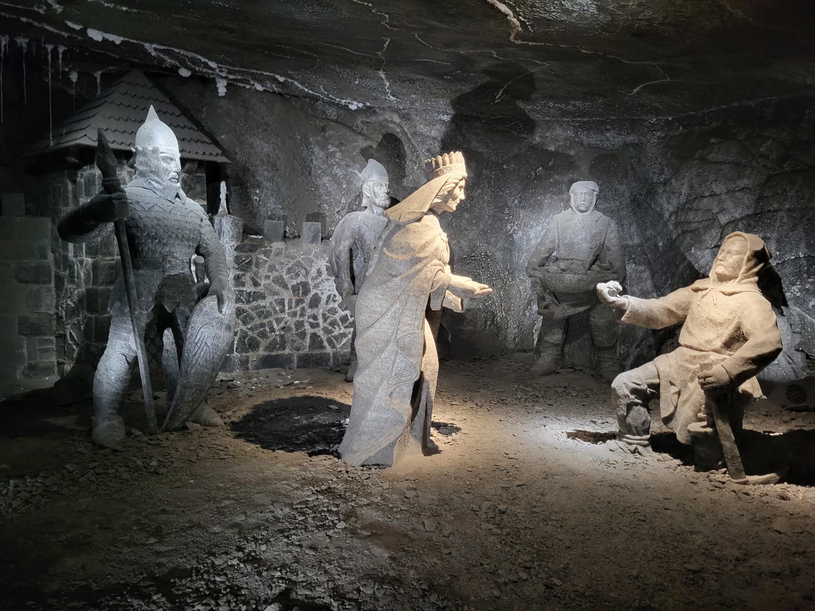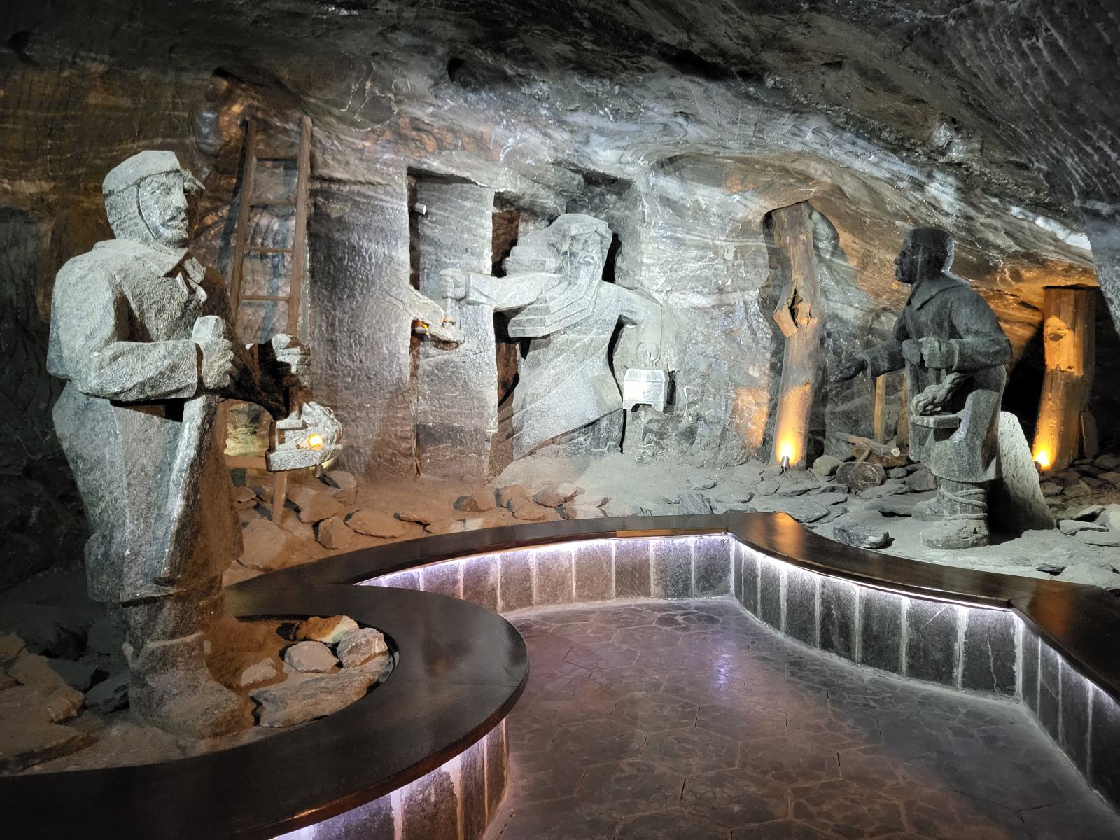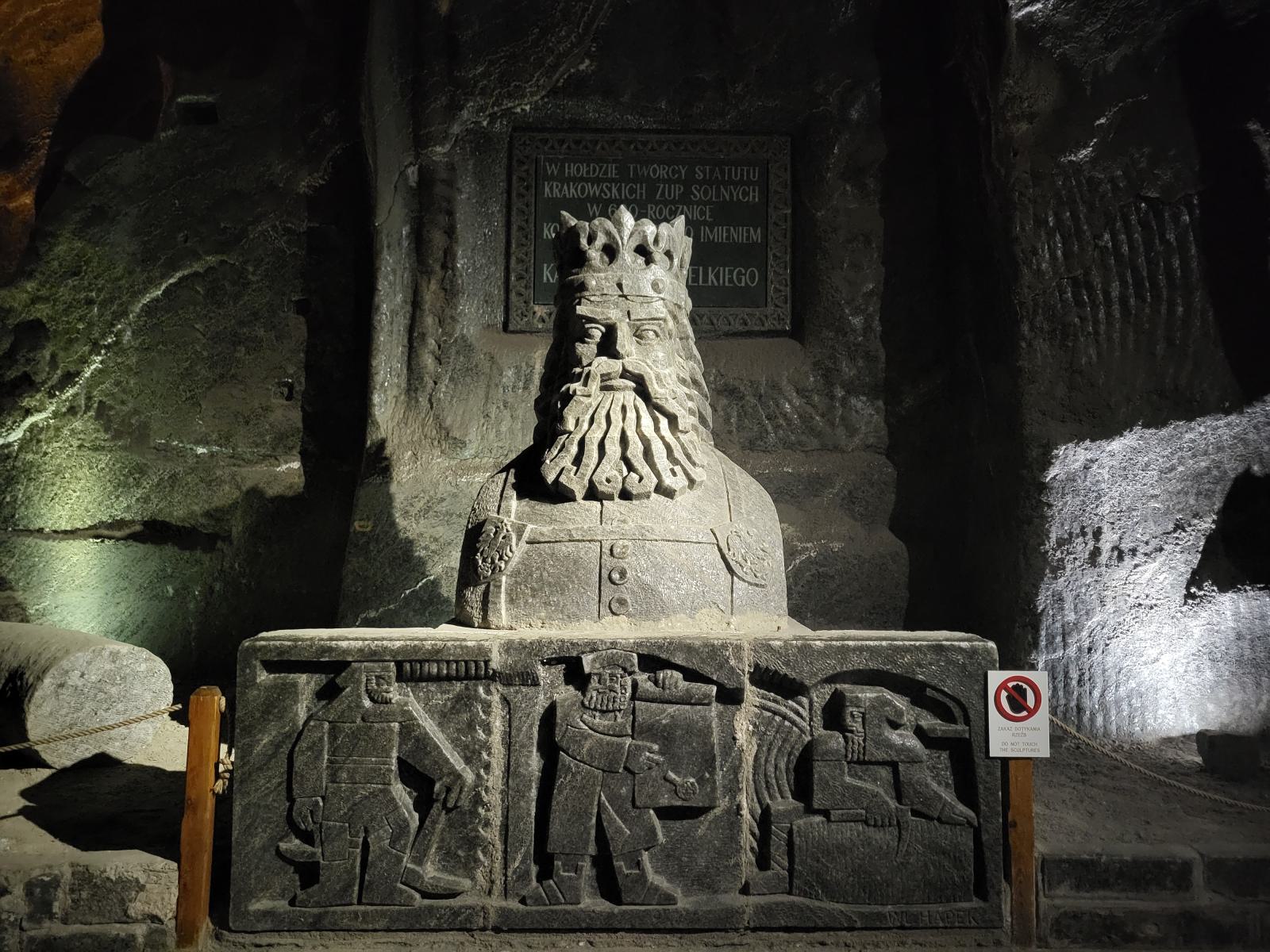 Drei Stunden verbrachten wir in den unterirdischen Räumen und erfuhren dann, dass wir nur etwa ein Prozent der Miene gesehen hatten. Dabei war vieles, was wir hier sahen einfach Wahnsinn, und davon sollte es noch viel mehr geben? Vieles, worüber wir hier staunten, war die Handarbeit von Bergleuten und über die gesamte Anlage verteilt. Es gibt verschiedene Ausstellungen mit lebensgroßen Skulpturen aus Salz. Dort ging es z.B. um die Gründungslegende der Miene. Dabei spielte die untreue ungarische Prinzessin, über die wir schon viel in Krakau erfahren hatten, eine entscheidende Rolle. Ein anderer Raum erzählte von den Minenarbeitern, die mit Fackeln nach Gas suchten um es abzubrennen. Die Szene war aus einer höhlenartigen Wand geschnitzt. Die Animation einer Explosion verdeutlichte, wie gefährlich das war. Auch die an der Arbeit beteiligten Pferde hatten ihren Platz. Neben einer originalen Förderanlage gab es ein kleines bewegtes Modell, mit dem man sich die harte Arbeit gut vorstellen konnte. Es gab Statuen von Kopernikus und von Goethe, Goethe ist scheinbar überall.