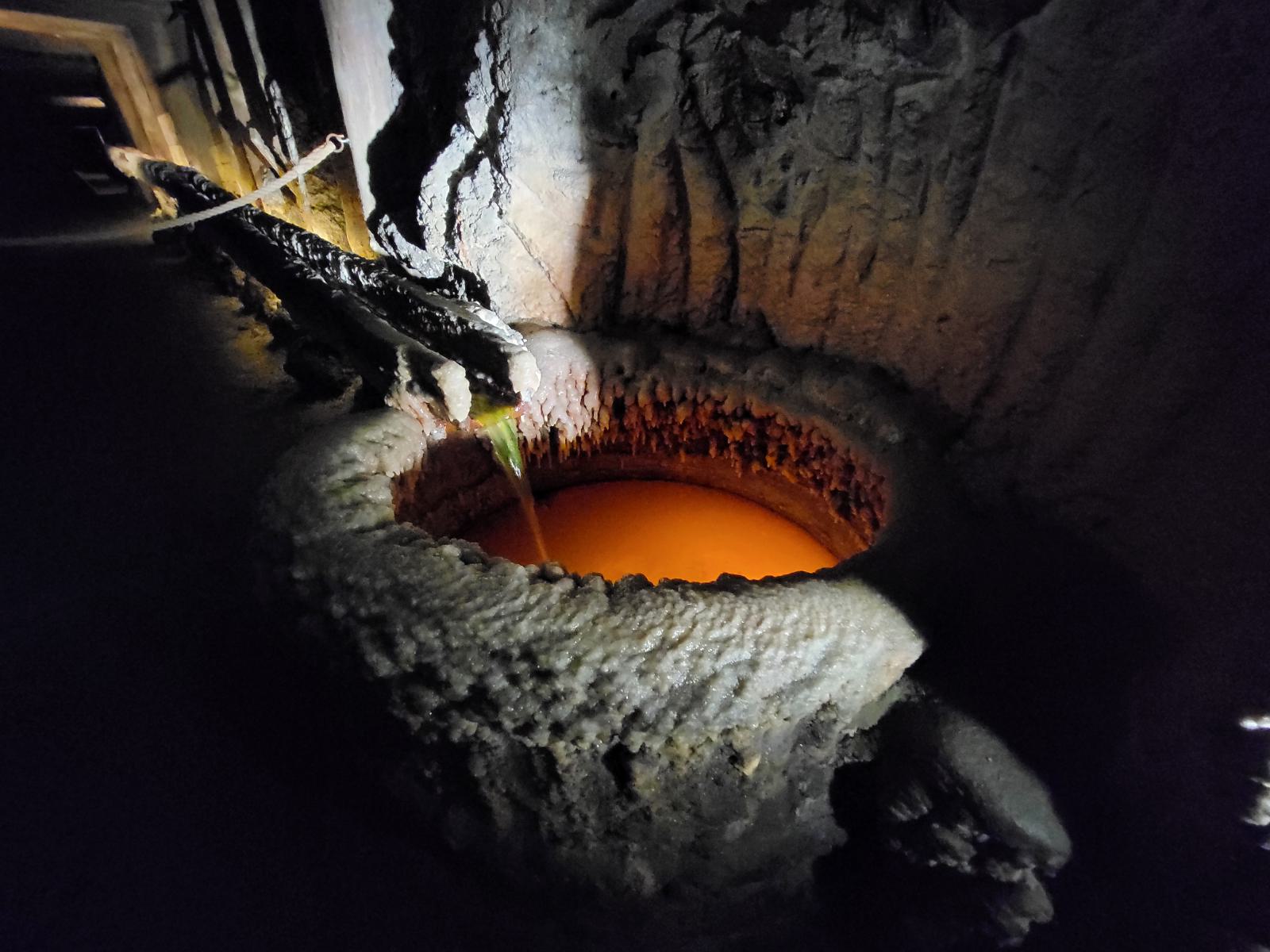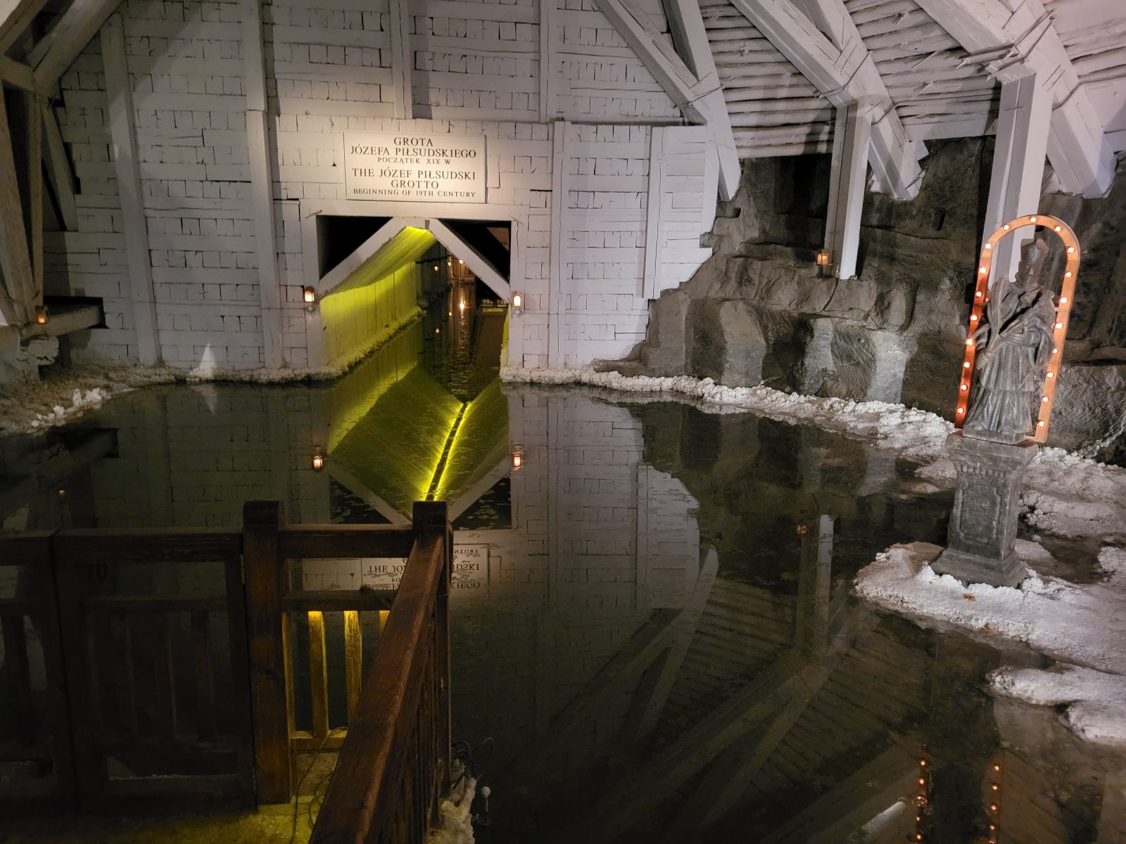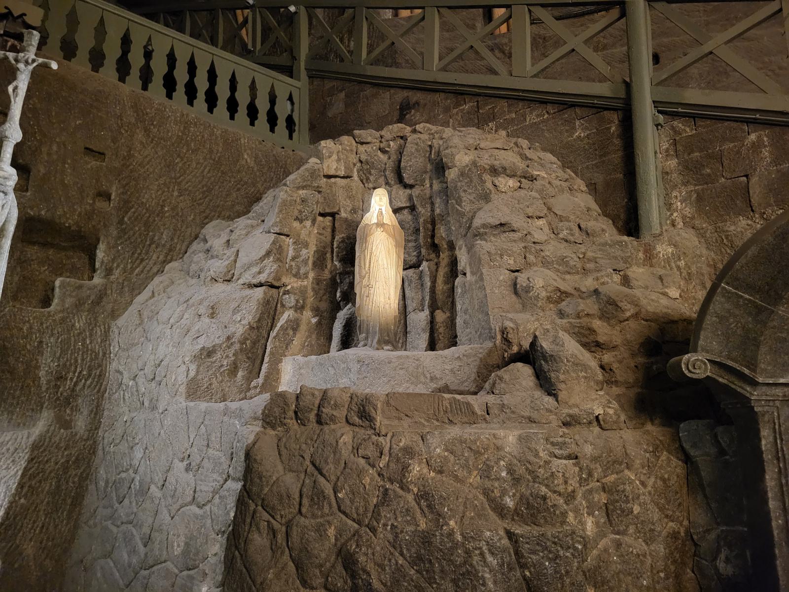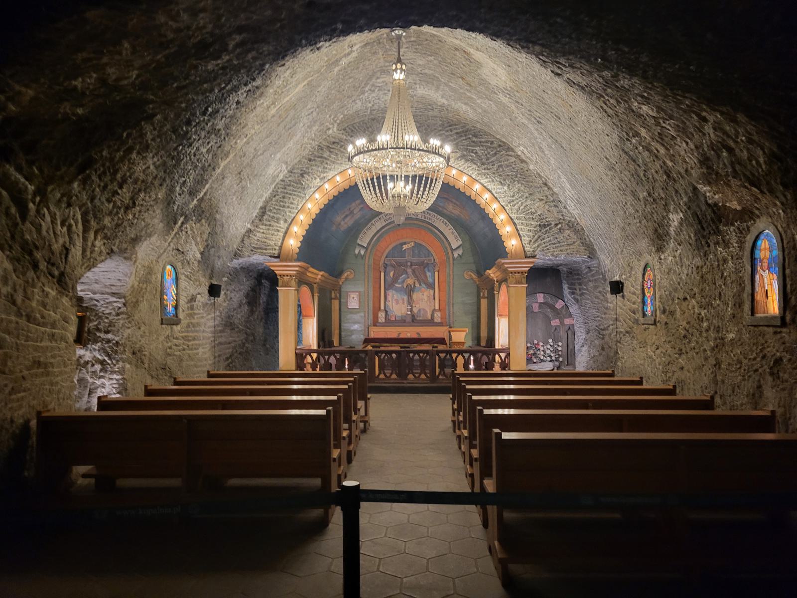 An einer Stelle konnten wir aus einer Salzquelle probieren, bäh. Der dazugehörige Brunnen war komplett verkrustet, kein Millimeter Holz war mehr zu sehen. In einem riesigen Raum mit Café, Tischen, Toiletten und Souvenirshops, wie ein kleiner, unterirdischer Markt, machten wir eine Pause. Danach kamen wir zu einer kleinen, hübschen Kapelle.