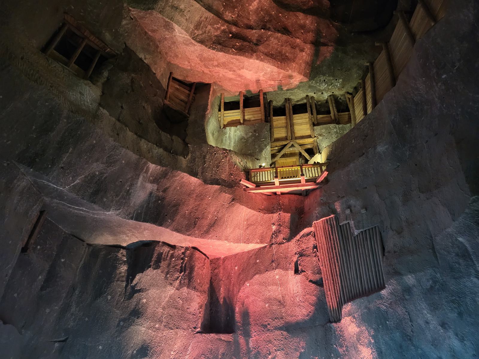 Die Führung endete in einem mehrere Stockwerke hohen, salzig-bunten Saal mit Panoramaaufzug und Aussichtsterrassen. Fast draußen, dachten wir. Haha. Erstmal legten wir noch eine Pause in der angrenzenden gemütlichen Kantine ein. Die ist wie alle Räume hier aus Salz und ein bisschen Holz. Zeit für ein Stück Kuchen. Auf dem Weg zum Aufzug kamen wir noch durch einen riesigen Festsaal mit Galerie, Bar und Bühne, den man für private Veranstaltungen mieten kann. Dahinter begann die Schlange für die Aufzüge. Als sich die Guide verabschiedet hatte, sagte sie noch, dass wir eine halbe Stunde zurück nach oben brauchen würden, aber die Schlange war jetzt garnicht so lang und wir wurden auch bald reingelassen.