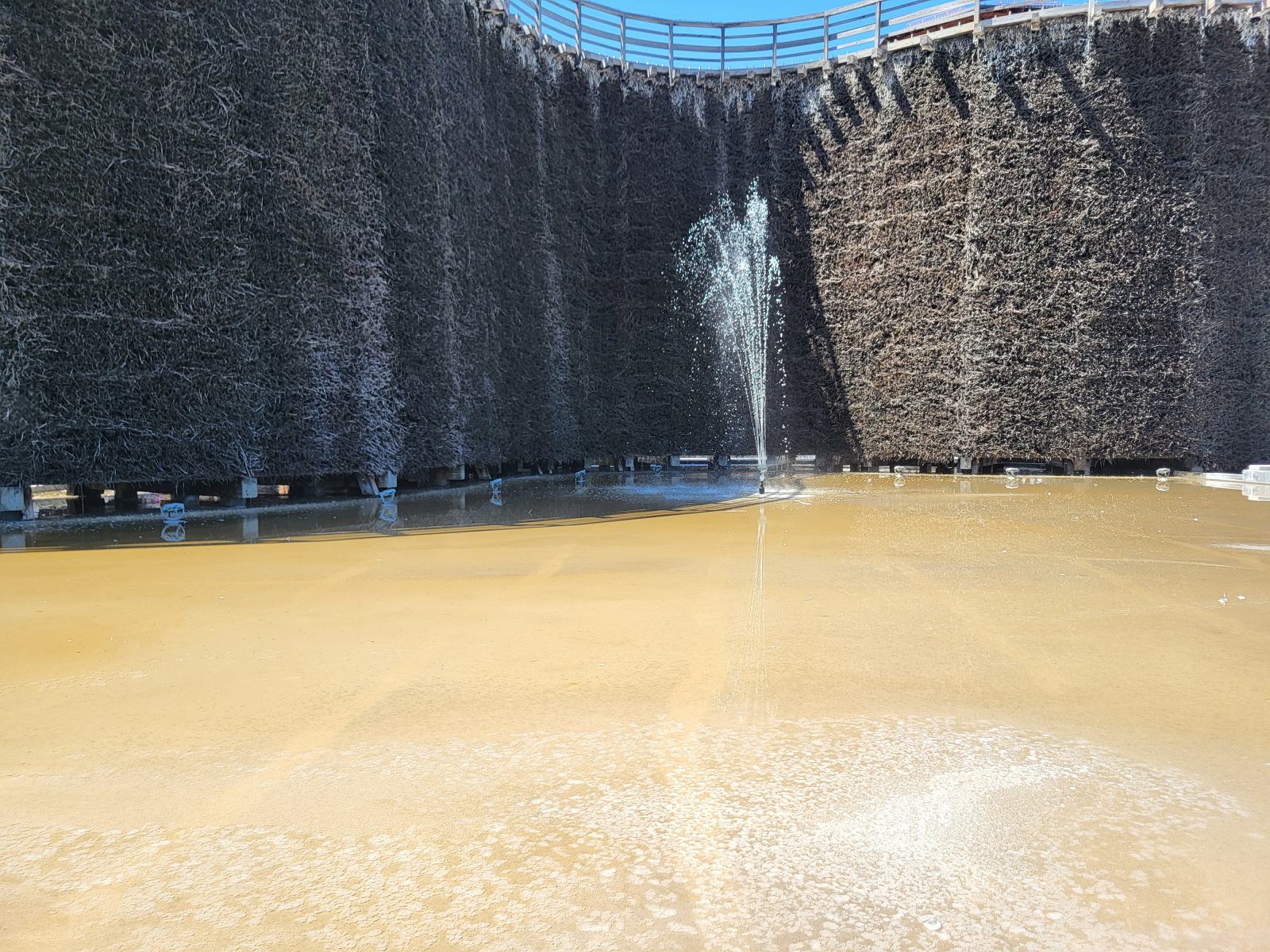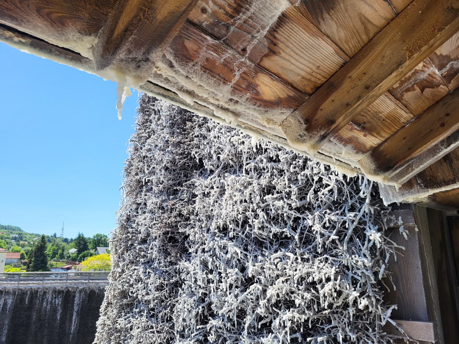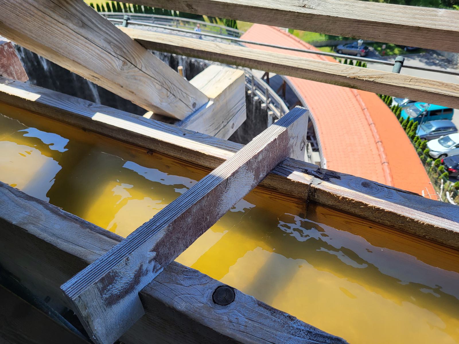 An den Dächern um den Turm herum hängt das Salz schon wie dicke Eiszapfen und auf dem oberen Gang liegen die Pumpen und Überlaufbecken, aus denen das Wasser herunter kommt.