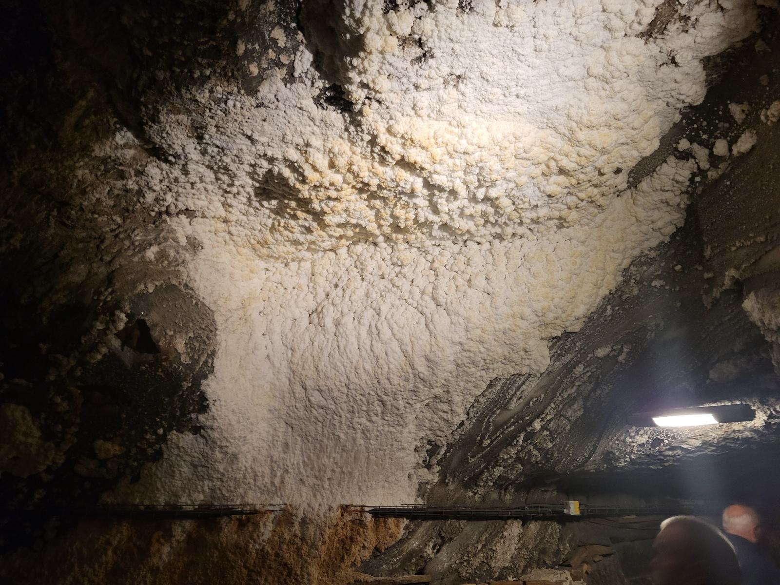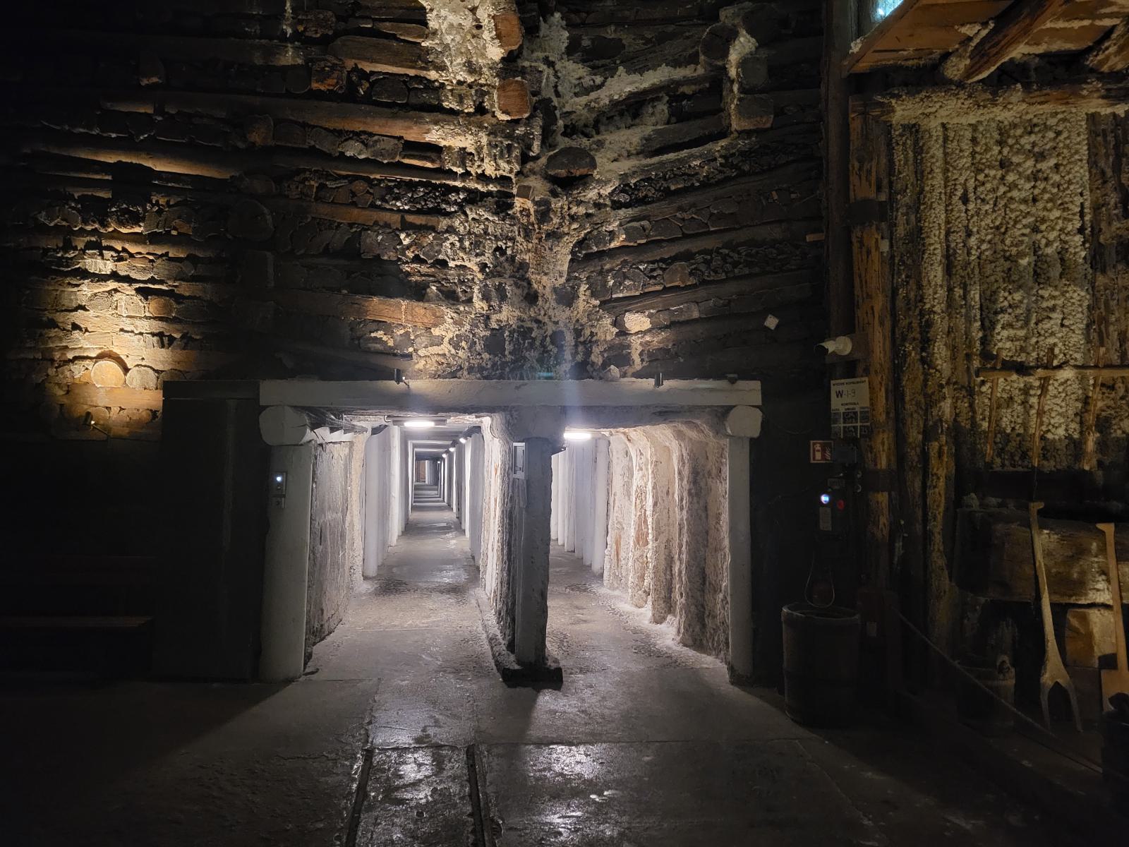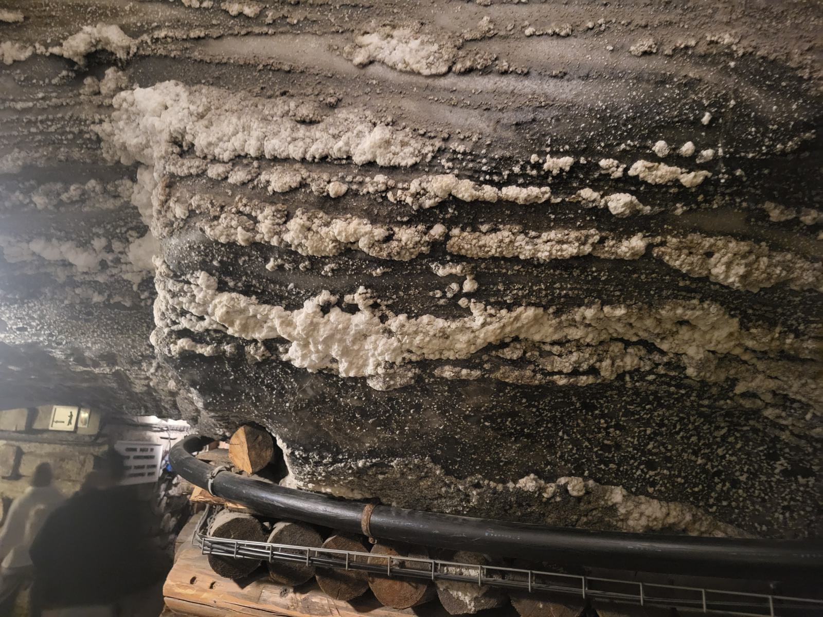 Unten gab es gleich die erste von vielen Luftschleusen, in die erstmal die ganze Gruppe rein musste, bevor die zweite Tür geöffnet wurde. Auf beiden Türen war wirklich sehr viel Druck. Der Gang dahinter war aus neuem, duftendem Holz, aber die ältesten Teile der Anlage sind über 500 Jahre alt. Die Gänge sind trotzdem alle breit und hoch, wahrscheinlich gab es da überall Salz zu holen. Die Balken der Decken und Wände sind in den älteren Teilen komplett mit Salz bedeckt und auch der Boden, den wir für Stein hielten, besteht komplett aus Salz. An manchen Stellen wurden sogar Lecksteine als Pflaster verlegt. Die Guide hielt eine Taschenlampe dran, damit wir sehen konnten, dass das Licht hindurch scheint.