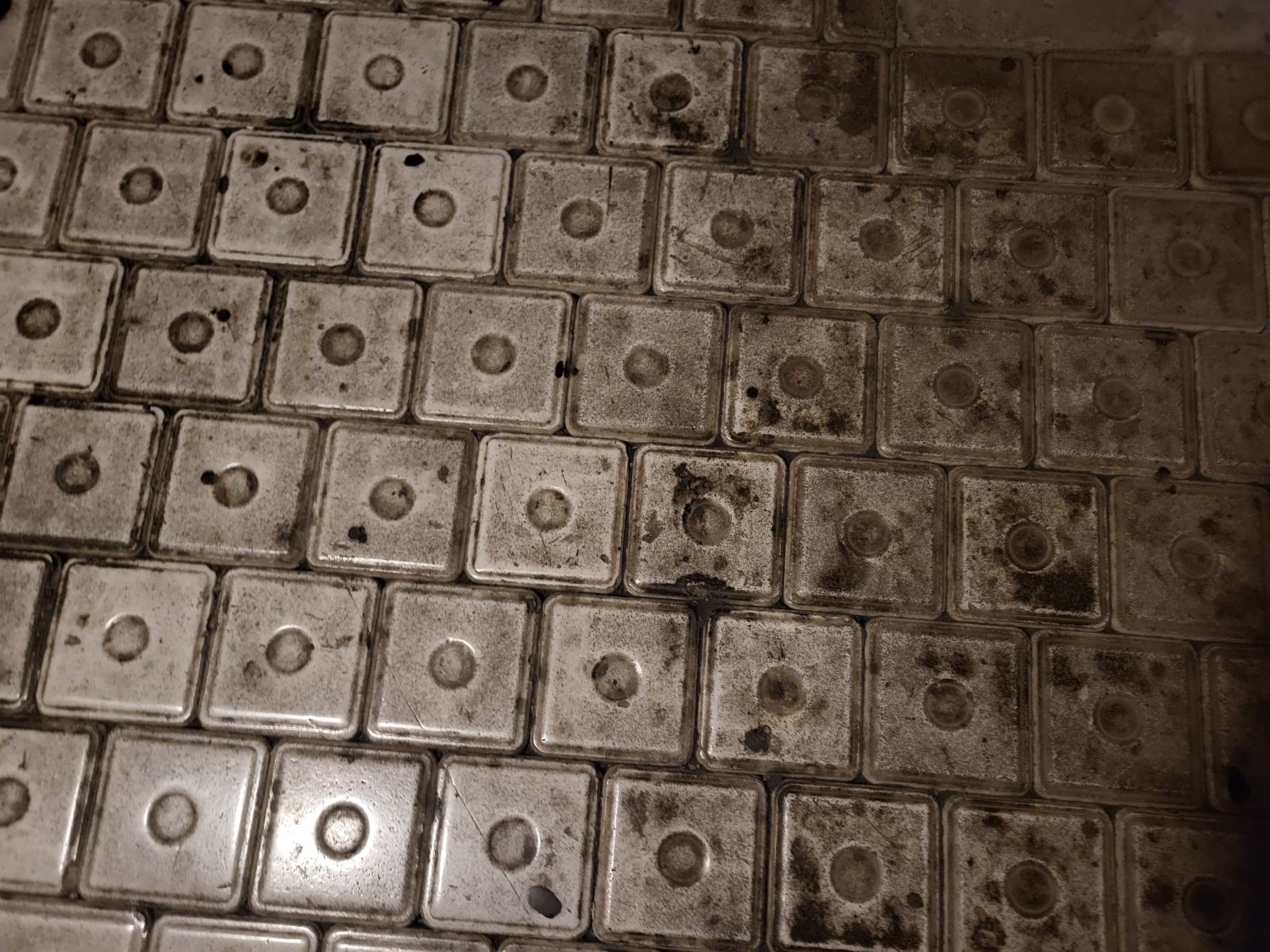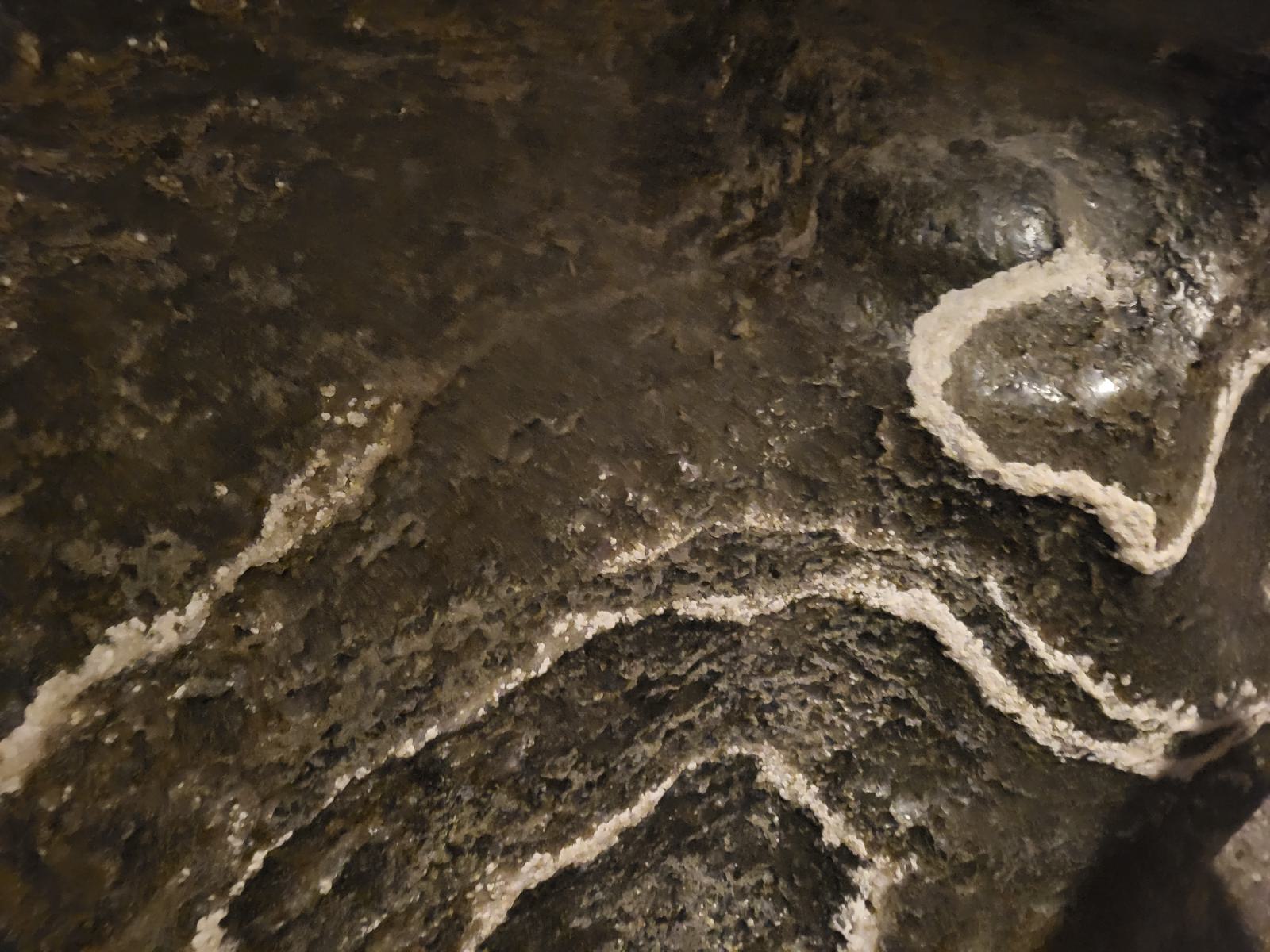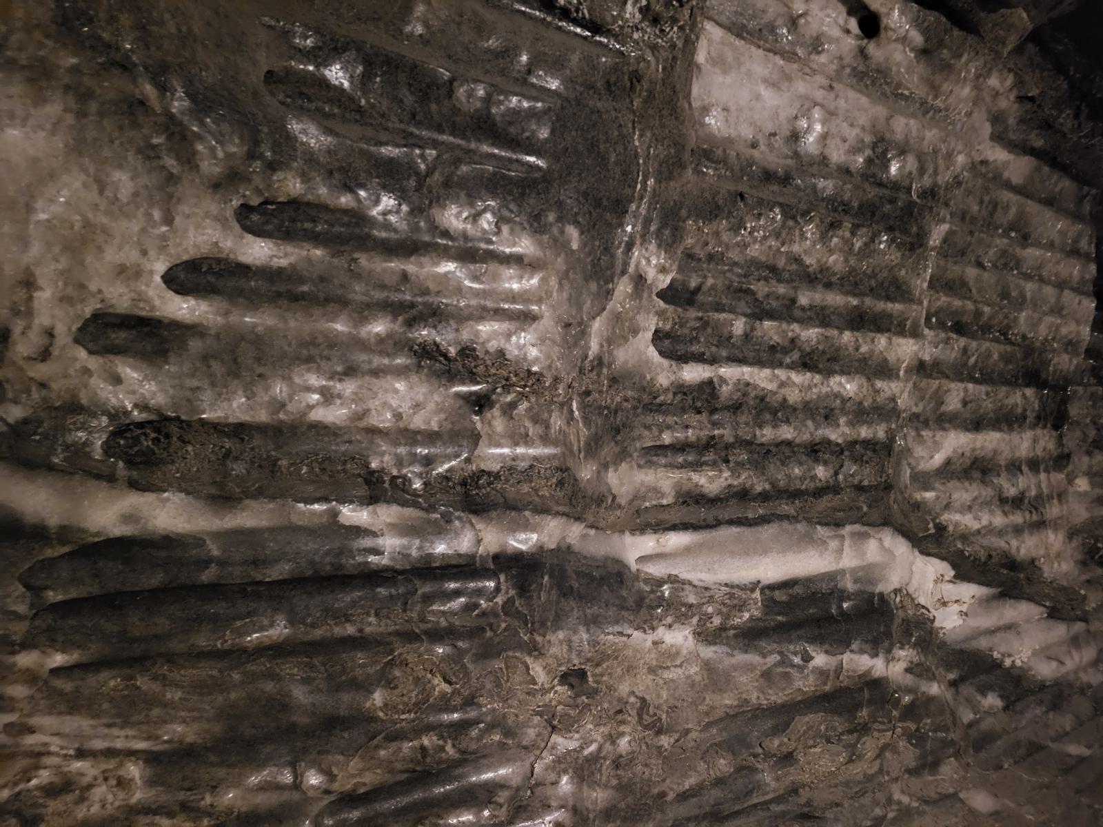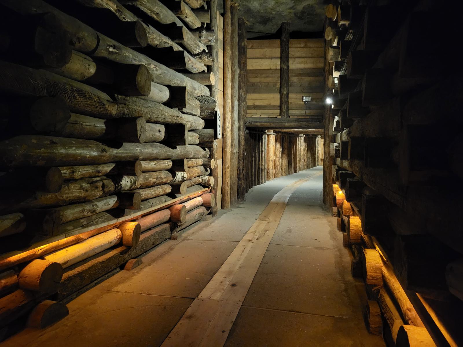 Unten gab es gleich die erste von vielen Luftschleusen, in die erstmal die ganze Gruppe rein musste, bevor die zweite Tür geöffnet wurde. Auf beiden Türen war wirklich sehr viel Druck. Der Gang dahinter war aus neuem, duftendem Holz, aber die ältesten Teile der Anlage sind über 500 Jahre alt. Die Gänge sind trotzdem alle breit und hoch, wahrscheinlich gab es da überall Salz zu holen. Die Balken der Decken und Wände sind in den älteren Teilen komplett mit Salz bedeckt und auch der Boden, den wir für Stein hielten, besteht komplett aus Salz. An manchen Stellen wurden sogar Lecksteine als Pflaster verlegt. Die Guide hielt eine Taschenlampe dran, damit wir sehen konnten, dass das Licht hindurch scheint.