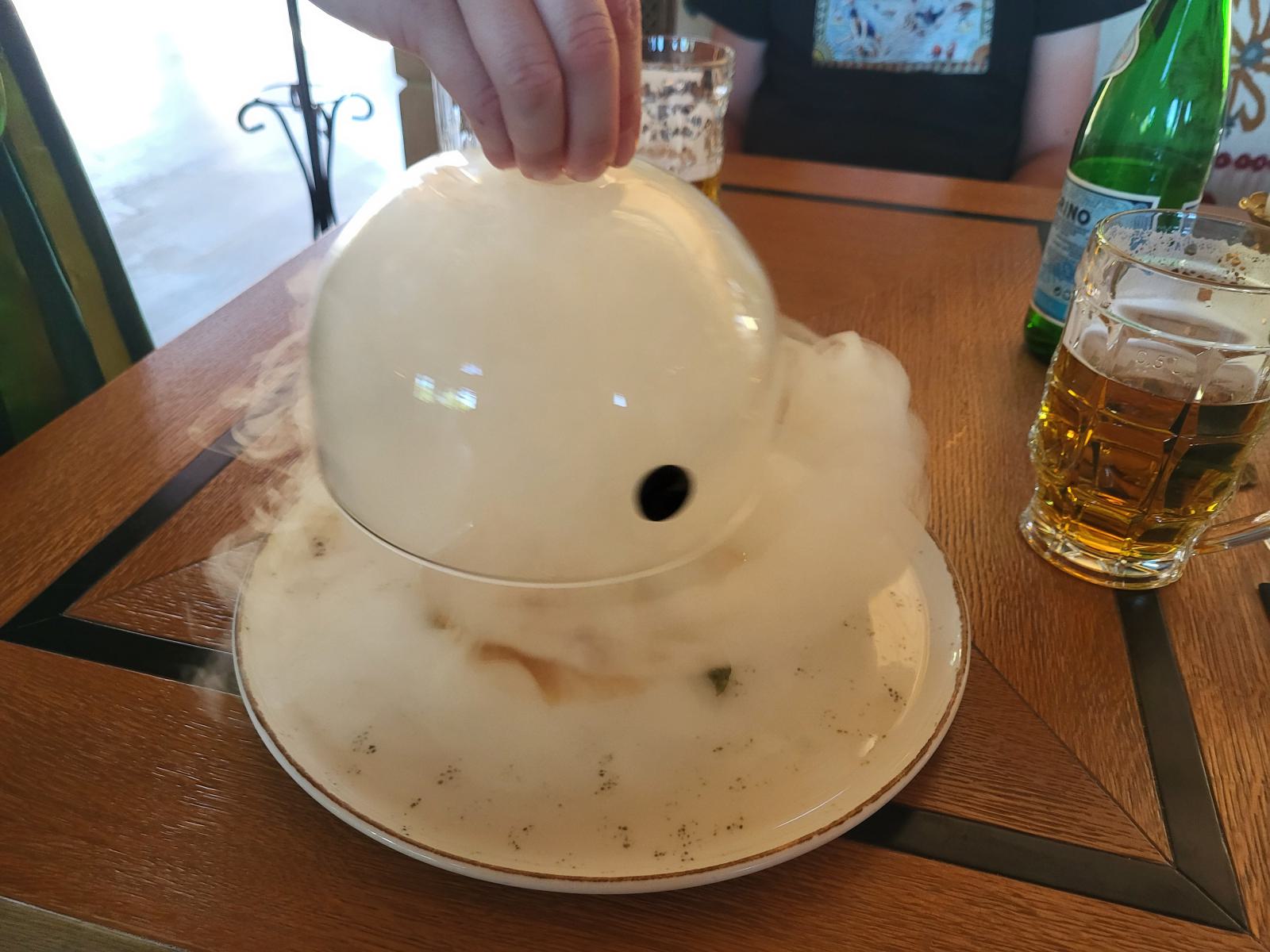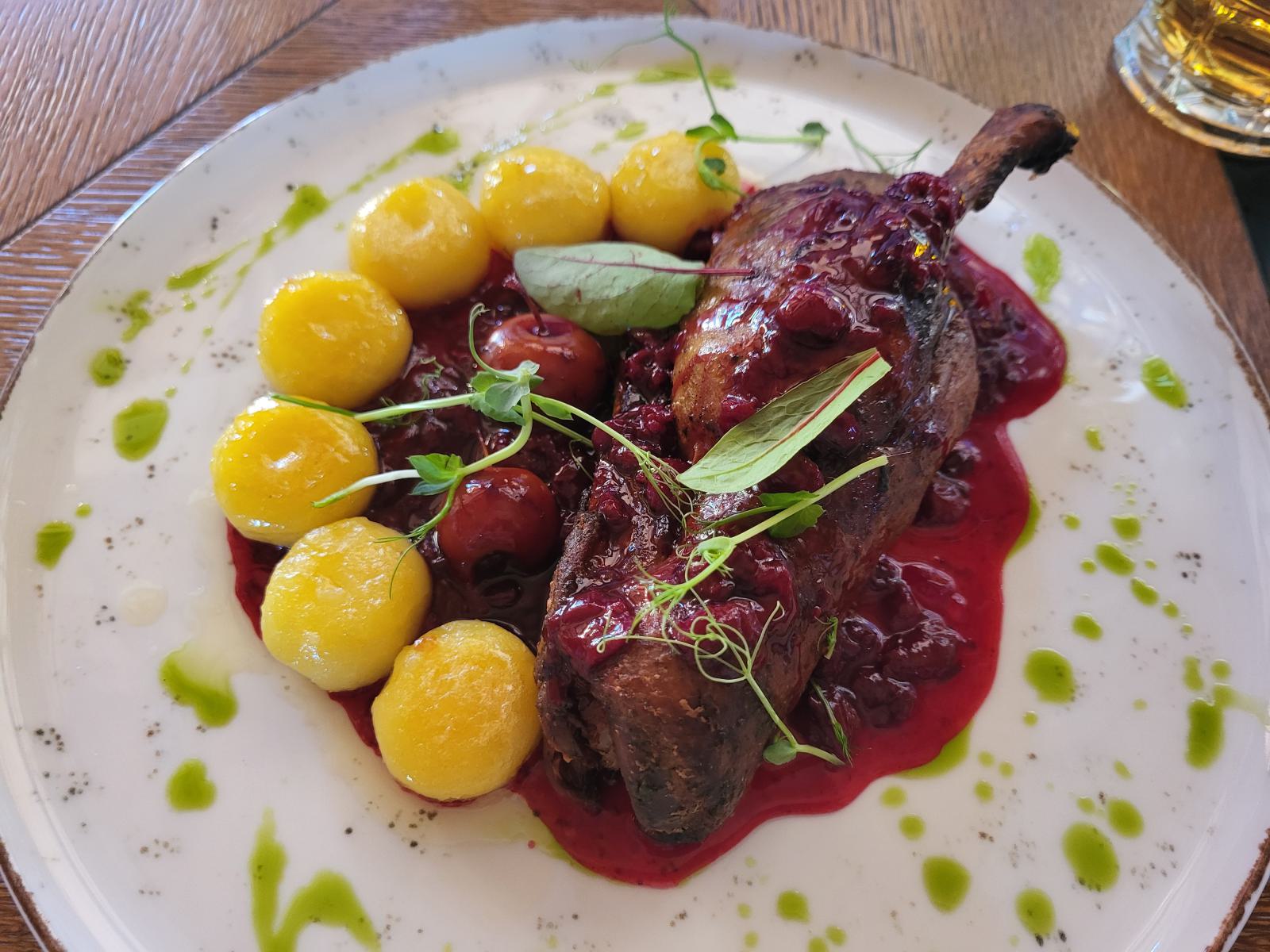 Von der unerwarteten Wanderung hungrig, fuhren wir in die Stadt und suchten ein Restaurant, in dem wir die lokale Küche probieren konnten. Im Góralska Tradycja wurden wir fündig. Einen Teil davon kannten wir schon. Der geräucherte Käse kommt aus Zakopane. Wie zu erwarten war der hier besonders gut und räucherte sogar noch am Tisch. Eine andere leckere regionale Spezialität ist gebratene Entenkeule mit Pflaumensoße.